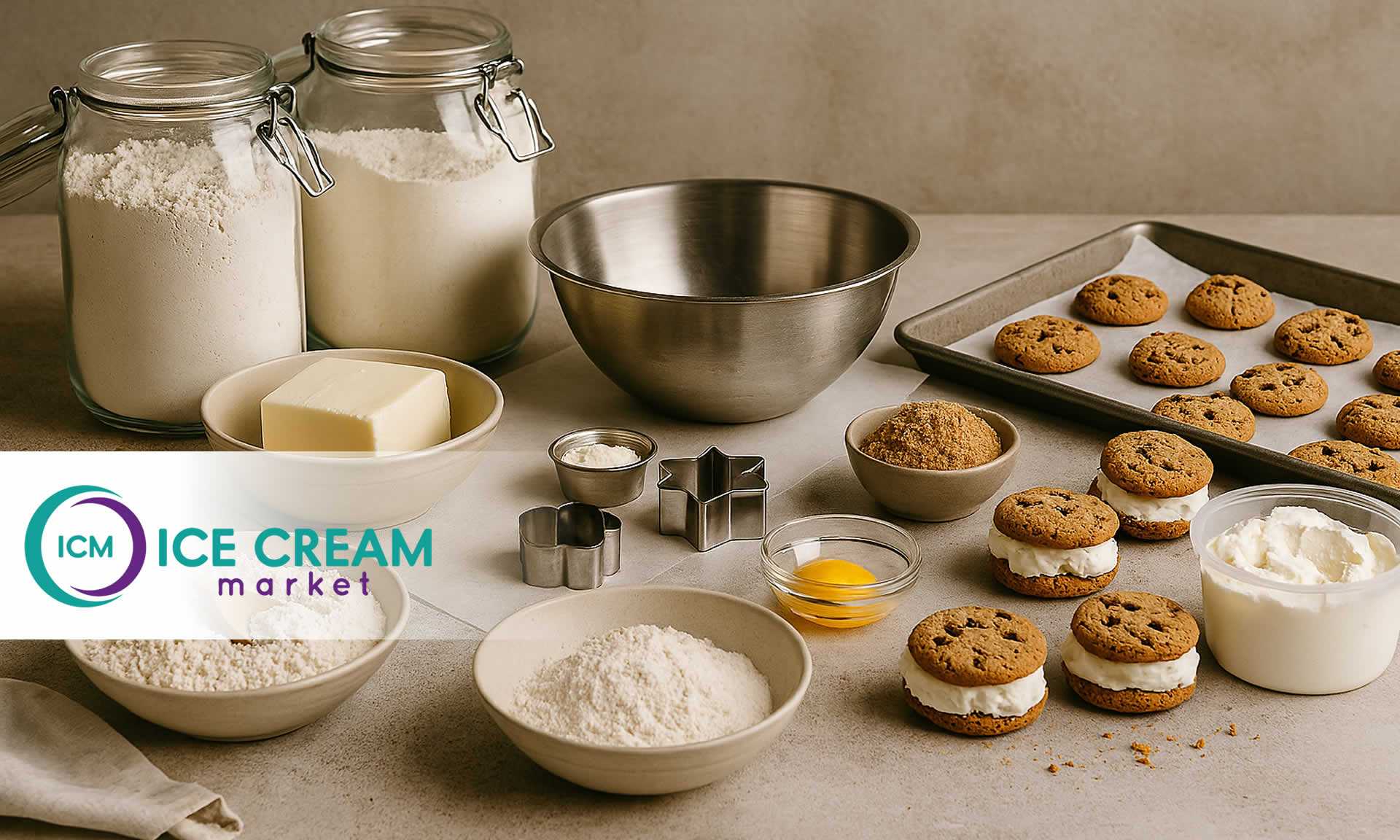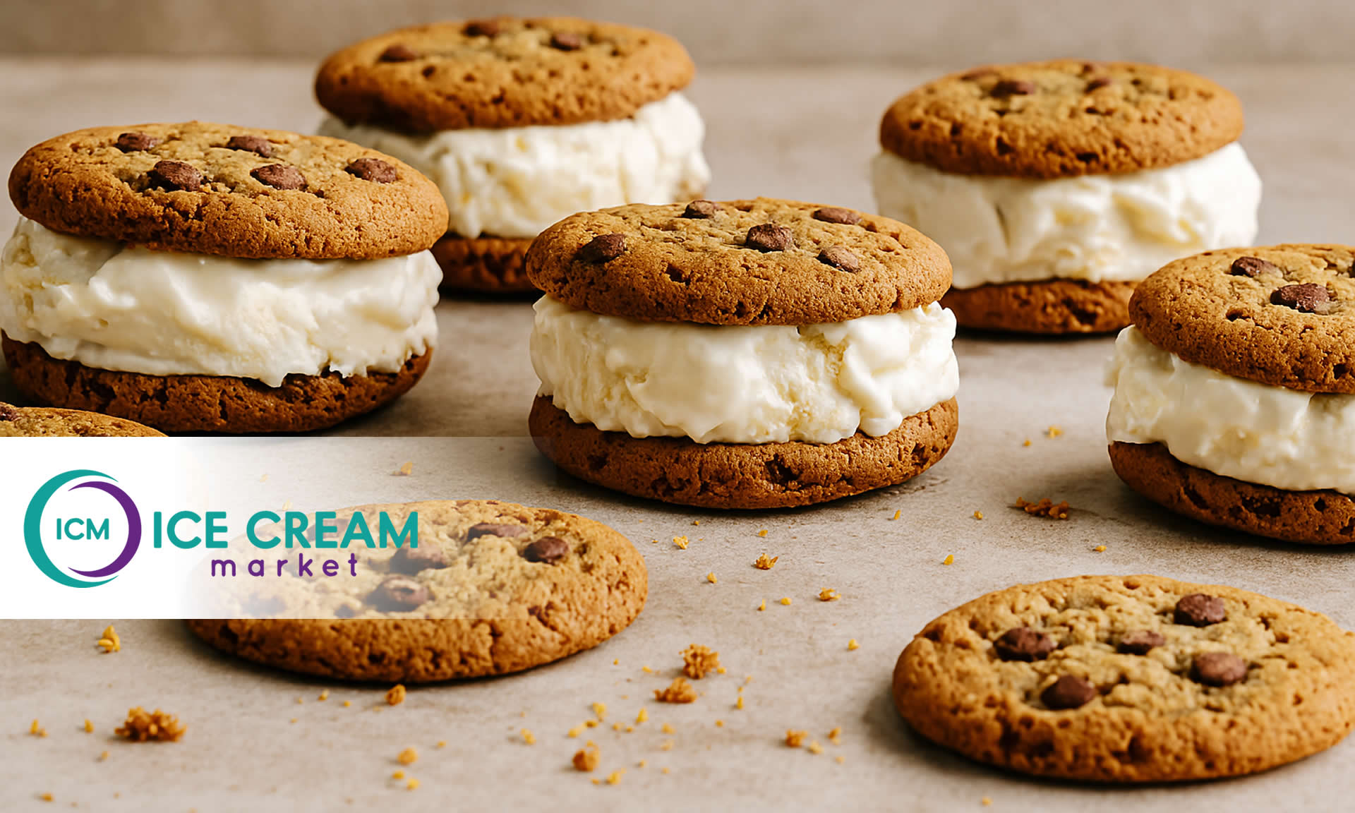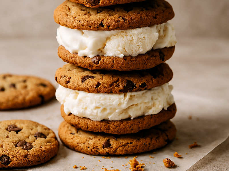 Galletas crujientes recién horneadas envuelven un centro cremoso y frío, creando un postre irresistible y lleno de encanto.